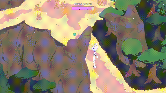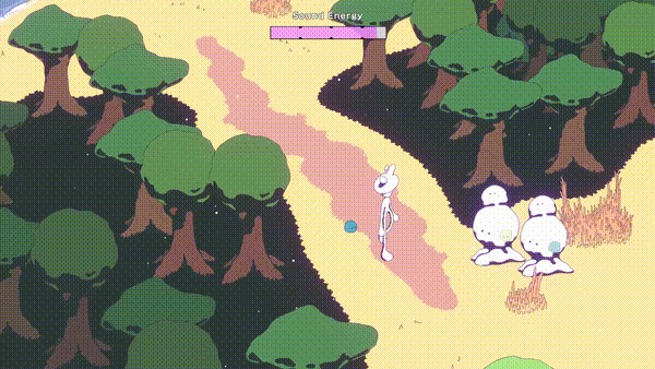 I’ve been prototyping an instrument upgrade Opie finds to help break through trickier Silence. As you keep time with the little indicator, Opie plays a big brassy melody, which pops nearby Silence creatures. Failing the timing causes the Silence to run away and regenerate.